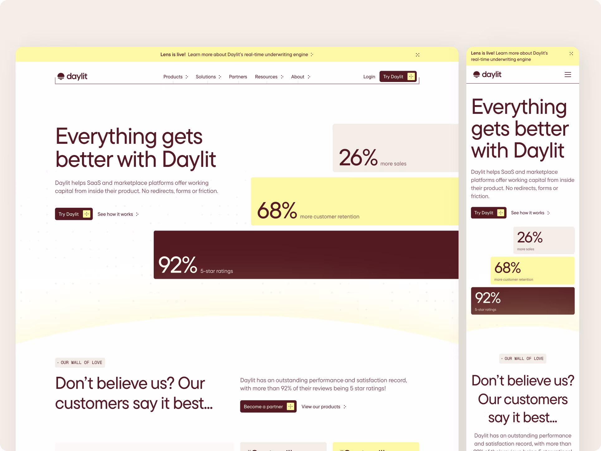 I created a modular design system in Figma to give Daylit’s team the ability to quickly build new landing pages and marketing assets without losing consistency. The system included reusable components, a refined colour palette centred on their signature yellow, and clear rules for typography and layouts. I also re-skinned platform screens in the new branding so their product visuals matched seamlessly with the site.