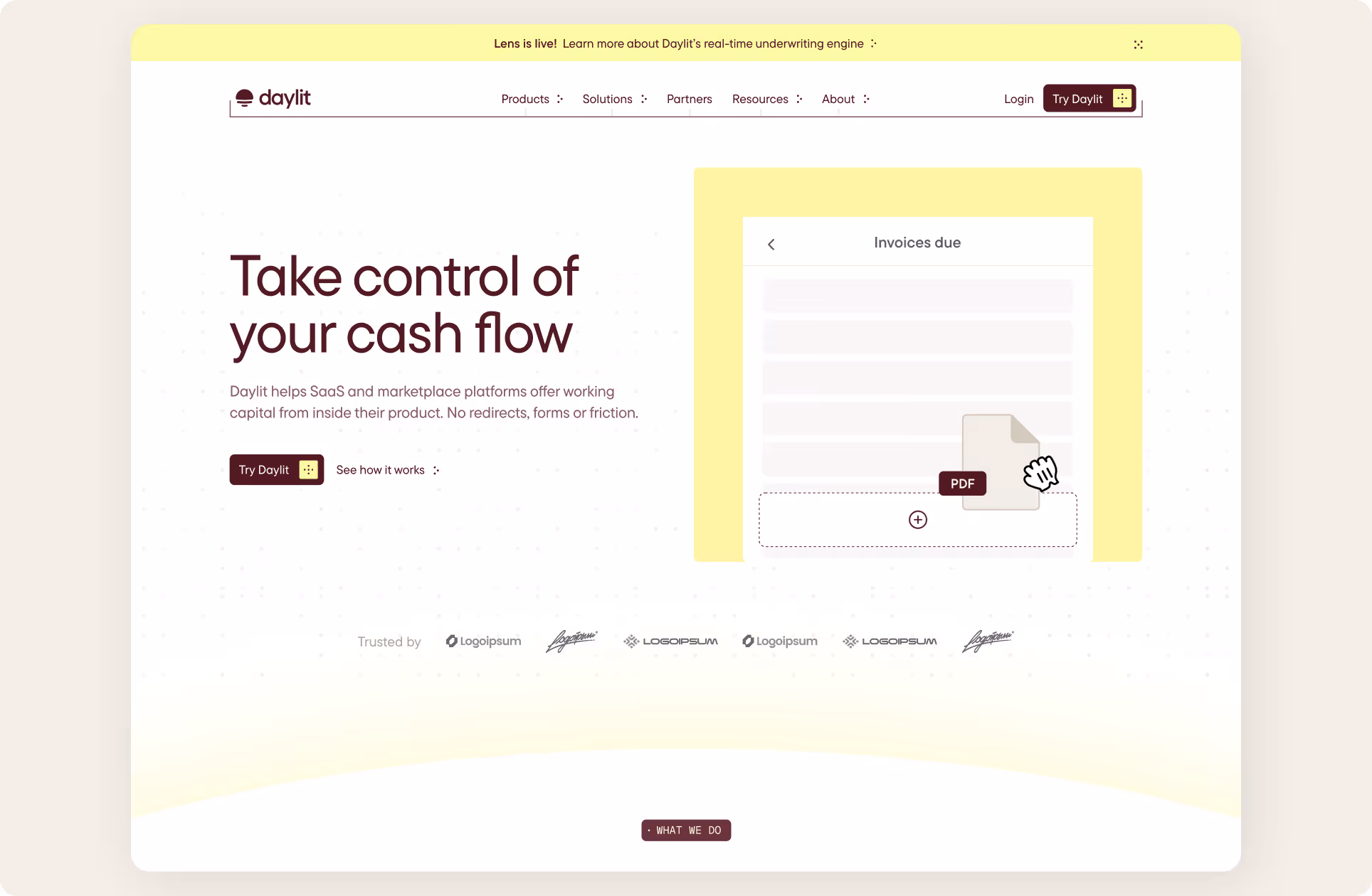 Daylit offers a working capital platform that gives businesses faster access to funds and better control over cash flow. By automating accounts receivable intelligence and offering flexible financing tools, Daylit helps companies cover day-to-day costs, make larger investments, and smooth out cash flow hiccups.